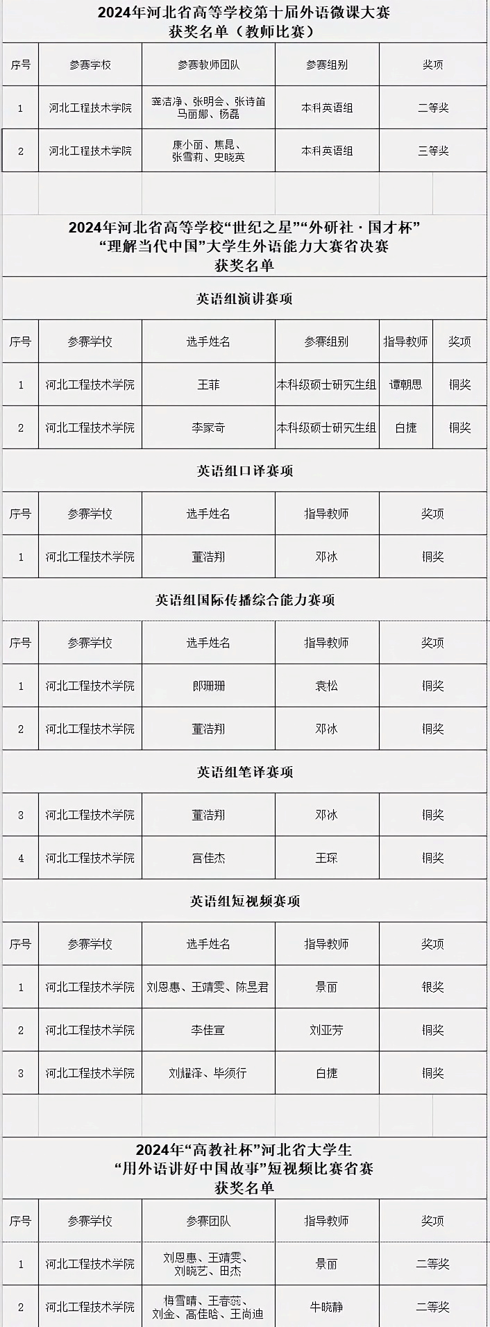 此次学生竞赛实现全赛道突破。其中,在2024年“高教社杯”河北省大学生“用外语讲好中国故事”短视频比赛中,刘晓艺和梅雪晴领衔的两组学生团队均获得二等奖。在2024年河北省高等学校“世纪之星”“外研社·国才杯”“理解当代中国”大学生外语能力大赛省决赛中,王菲、李家奇获得省级英语组演讲赛项铜奖,董浩翔获得省级英语组口译赛项铜奖;我校在笔译等传统优势赛道持续发力,郎珊珊、董浩翔获得省级英语组国际传播综合能力赛项铜奖,董浩翔、宫佳杰获得省级笔译赛项铜奖,刘恩惠、李佳宣、刘耀泽等领衔的三组学生团队均获得省级英语组短视频赛项铜奖。