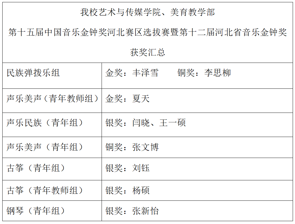 此次成绩是我校教师扎实的专业素养体现,也是学校在音乐人才培养和学科建设方面卓越成效的有力见证。今后,学校将继续强化专业建设,将比赛融入课程与教学实践,持续深化艺术教育,为推动河北省文化建设注入新动能。