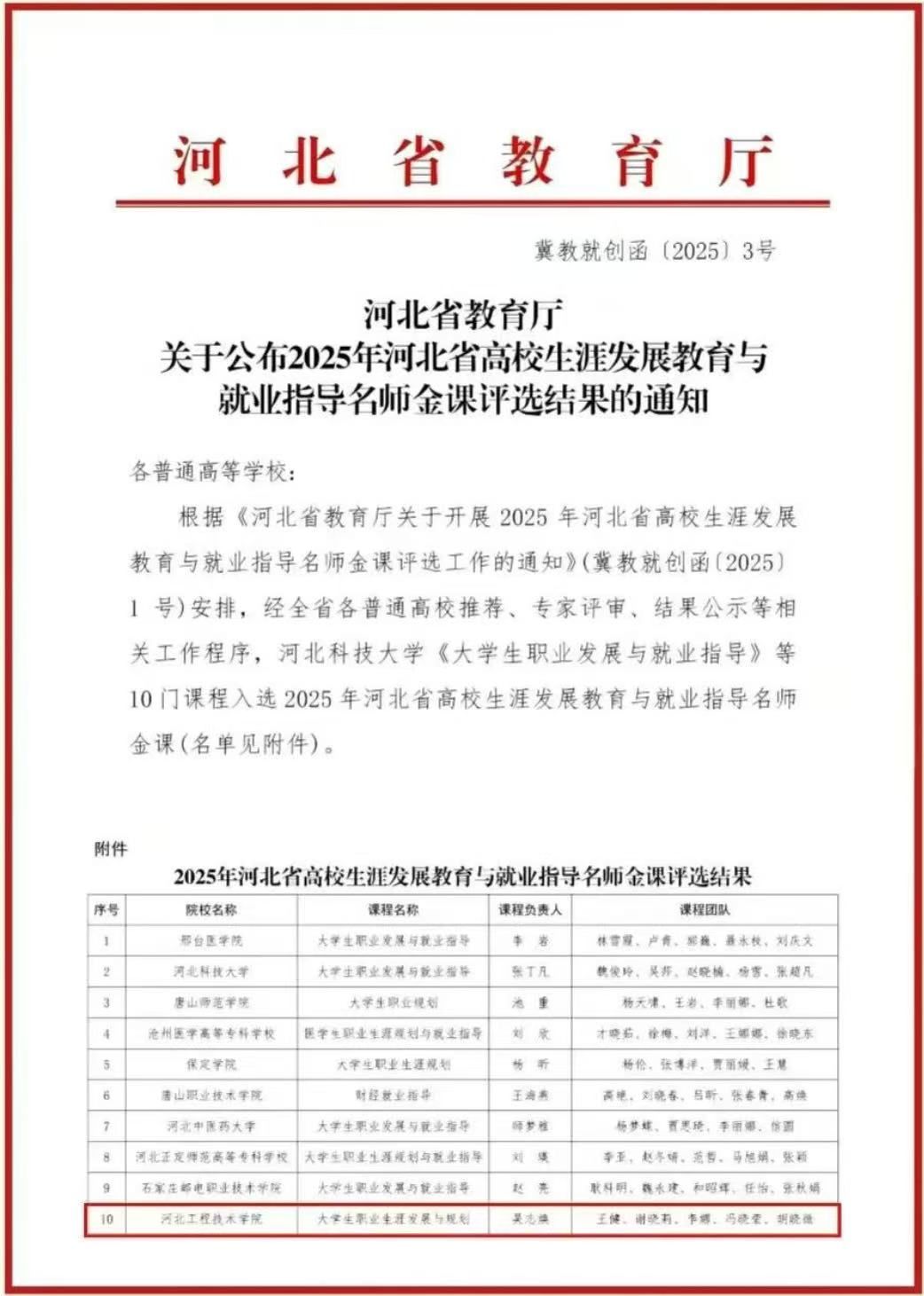 7月1日,河北省教育厅公布2025年河北省高校生涯发展教育与就业指导名师金课评选结果,我校组织申报的《大学生职业生涯发展与规划》课程被评为省级高校生涯发展教育与就业指导名师金课。